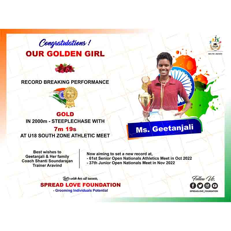 The greatest achievement of a person is the ability to bring about a change in others life. We have seen numerous examples, like how Dr. APJ Abdul Kalam changed the lives of many people. Recently, funds were required for Ms. Geetanjali, South zone record holder, to participate in an athletic meet. Arun Karthick(you Tuber), Senthil kumar, Vignesh kumar, Veerabthraswamy and Vethanayakam came forward and offered help to the cause. Spreadlove foundation would like to thank all the above people, and all spread love volunteers and Ms geethanjalis coaches Soundarya mam and Arvind for their constant support.