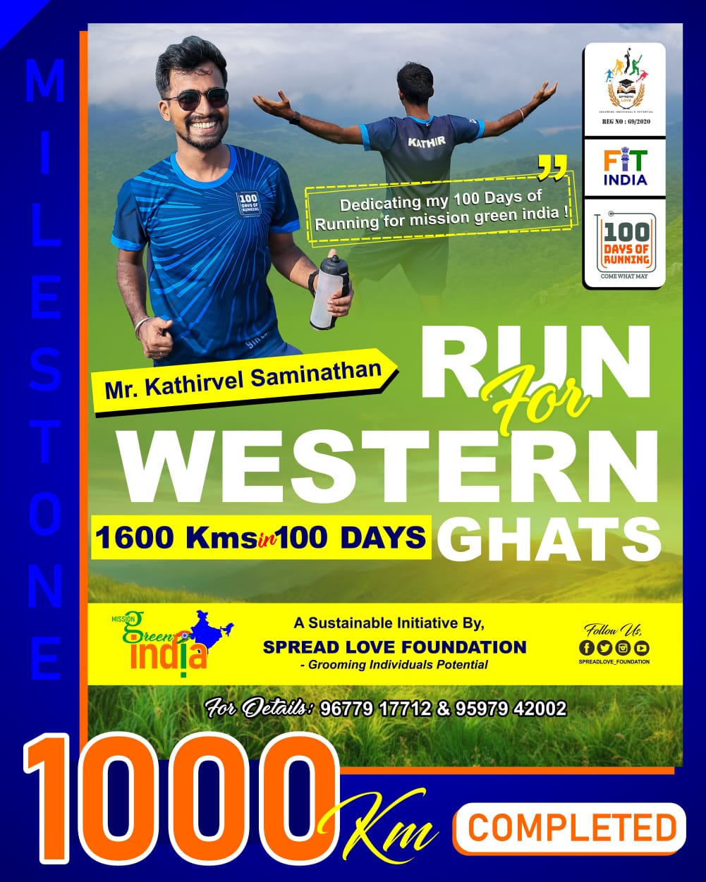 A sustainable initiative by SPREAD LOVE FOUNDATION. Mr.Kathirvel Saminathan is dedicating his "100 days of Running" to Mission Green India with total running distance of 1600kms which is equivalent to the length of Western Ghats. This initiative is to create awareness on the preservation of its rich biological diversity. Many volunteers have joined on the way to and supported for this Campaign. #SpreadLoveForGreenIndia #RunForWesternGhats